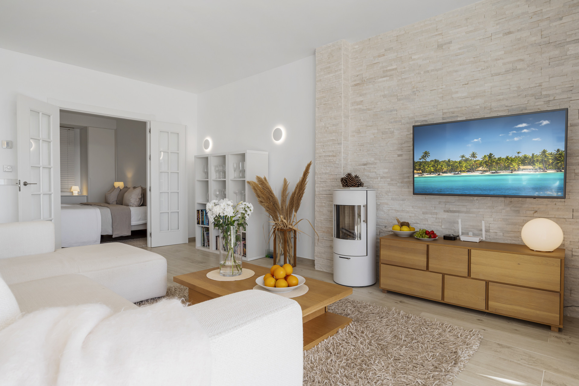 Välkommen till Casa Cielo! Casa Cielo är en vackert presenterad 2-rumslägenhet med 1 badrum i Aldea Blanca, som erbjuder modern komfort i ett av Nueva Andalucías mest eftertraktade inhägnade bostadsområden. Lägenheten har en ljus öppen planlösning där vardagsrum, matplats och kök flyter sömlöst samman och skapar en rymlig och social miljö fylld av naturligt ljus. Stora skjutbara glasdörrar förbinder interiören direkt med terrassen och förstärker den luftiga känslan överallt. Ett av sovrummen smälter obemärkt in i vardagsrummet och skapar ett flexibelt utrymme som kan fungera som ett extra loungerum eller gästområde, samtidigt som lägenhetens öppna, moderna estetik bibehålls. Varma trägolv och neutrala toner ger hemmet en lugn, modern atmosfär.