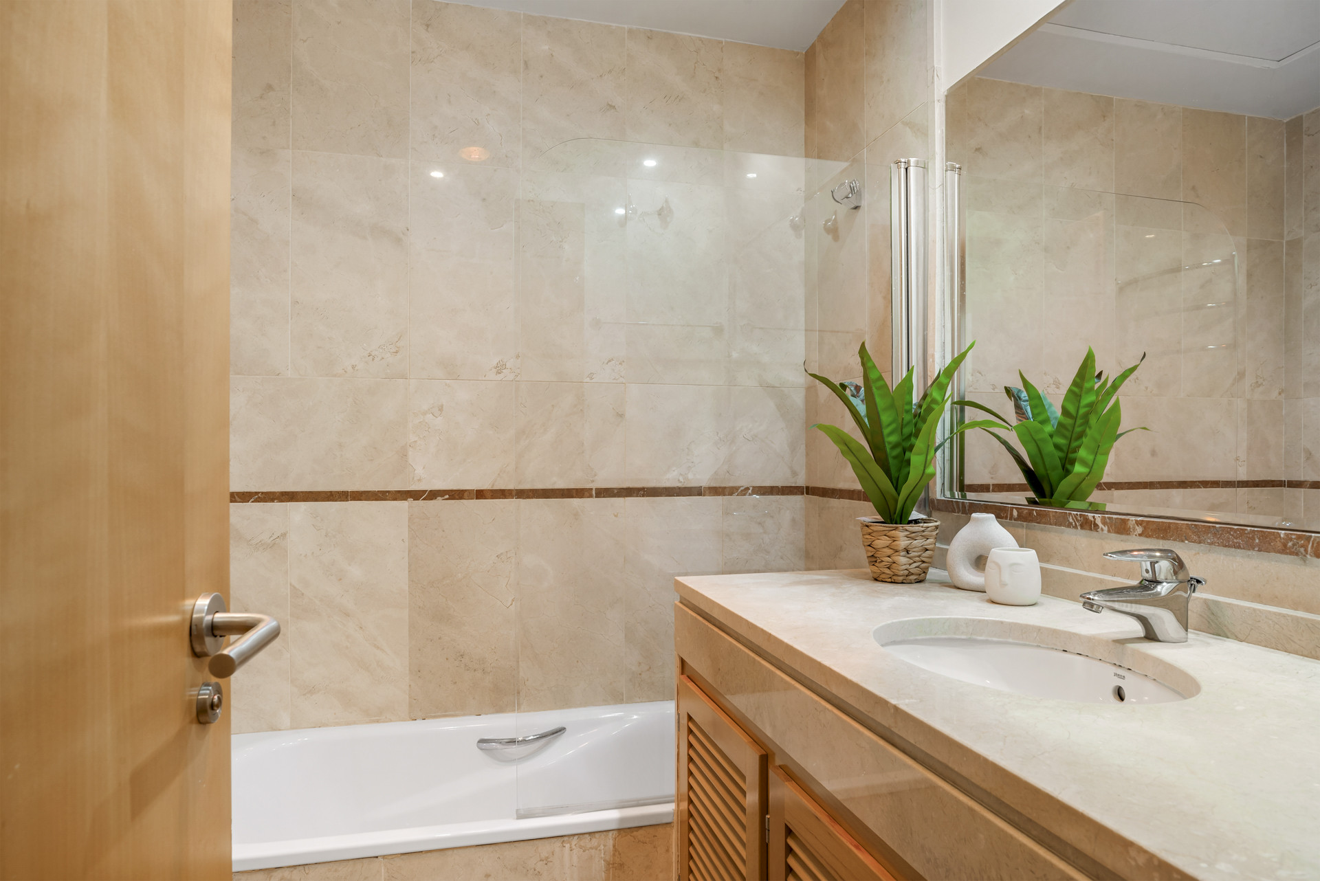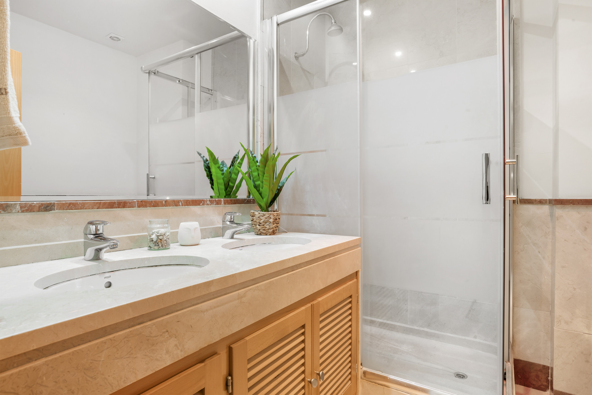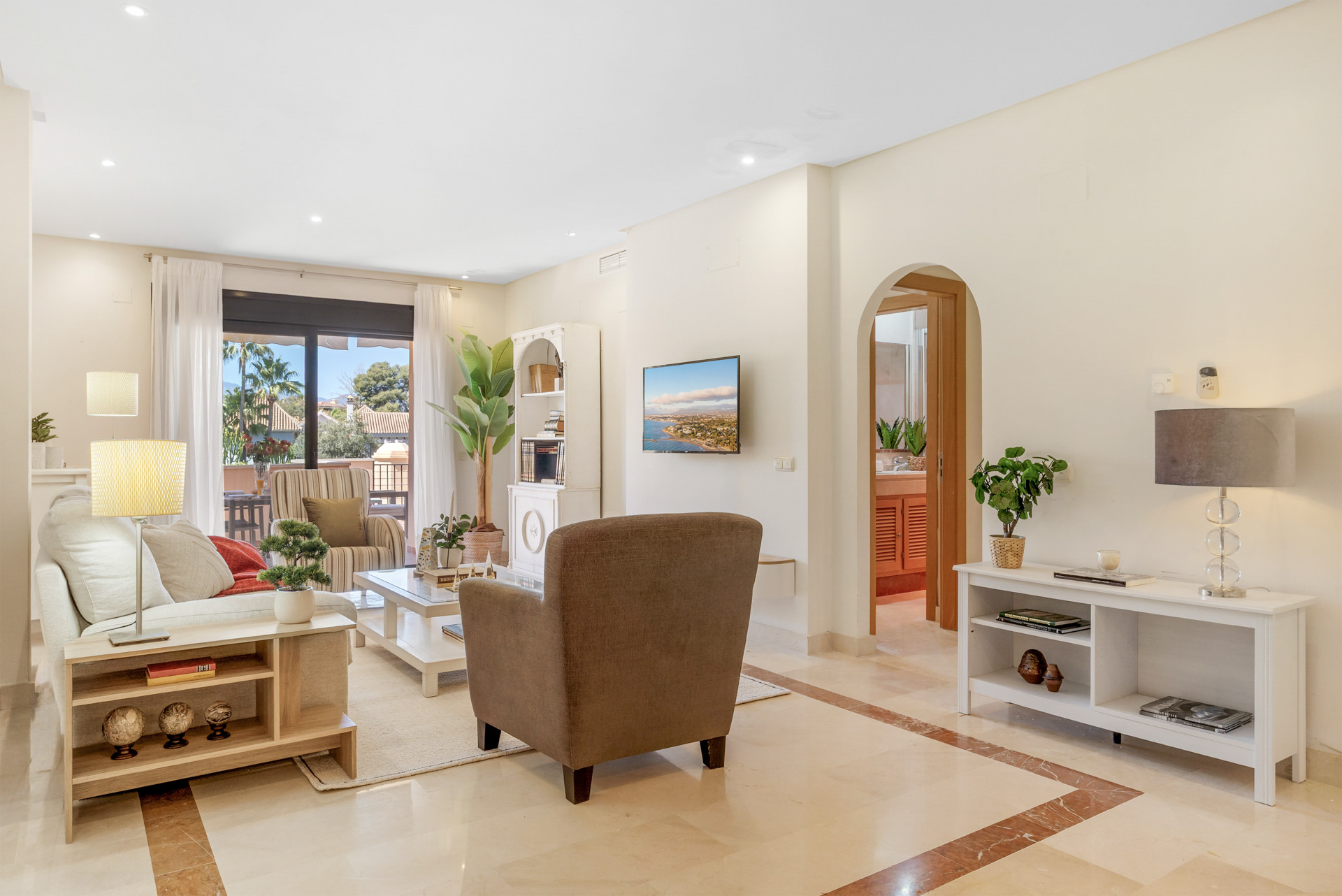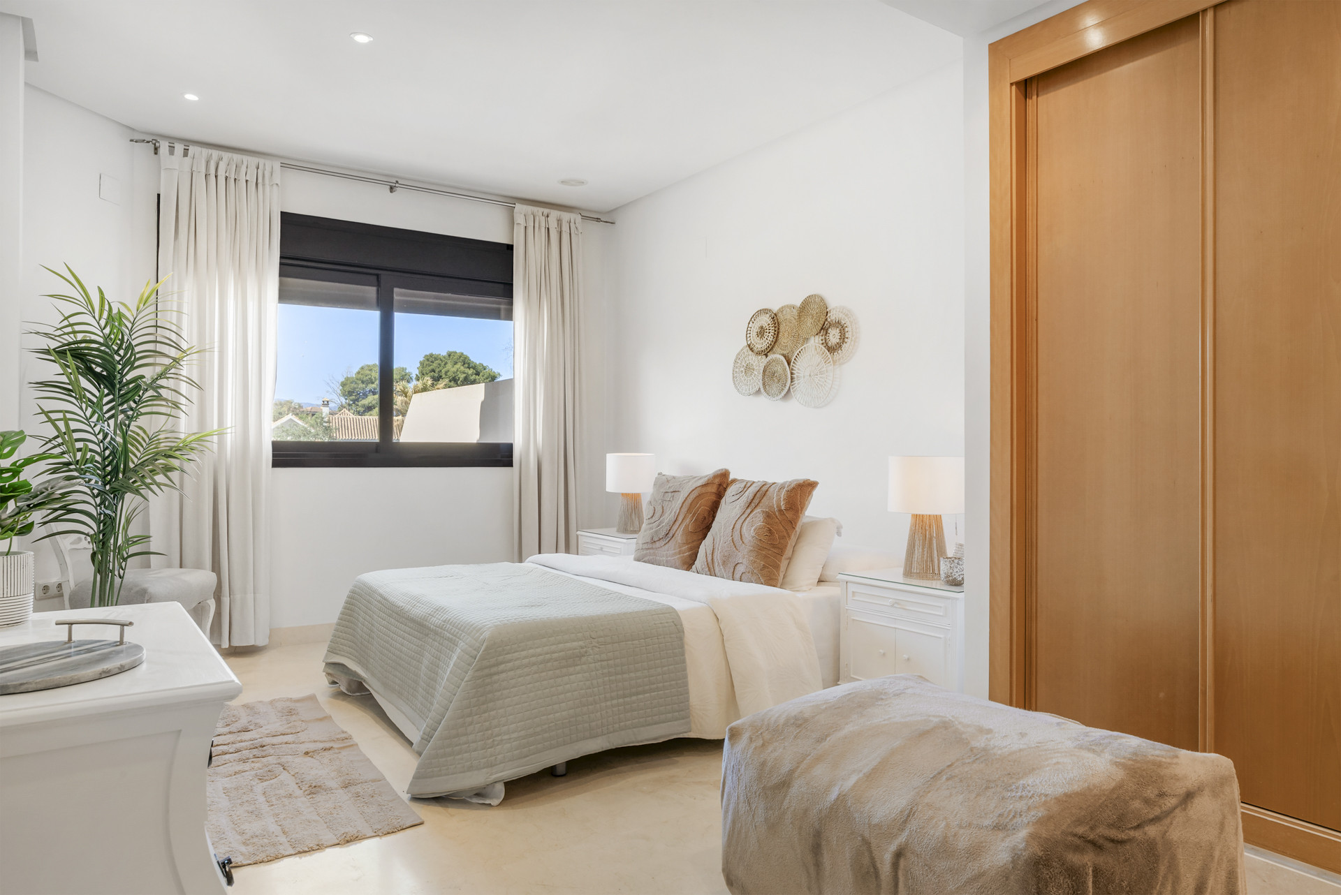 Välkommen till Casa Cielo! Casa Cielo är en vackert presenterad 2-rumslägenhet med 1 badrum i Aldea Blanca, som erbjuder modern komfort i ett av Nueva Andalucías mest eftertraktade inhägnade bostadsområden. Lägenheten har en ljus öppen planlösning där vardagsrum, matplats och kök flyter sömlöst samman och skapar en rymlig och social miljö fylld av naturligt ljus. Stora skjutbara glasdörrar förbinder interiören direkt med terrassen och förstärker den luftiga känslan överallt. Ett av sovrummen smälter obemärkt in i vardagsrummet och skapar ett flexibelt utrymme som kan fungera som ett extra loungerum eller gästområde, samtidigt som lägenhetens öppna, moderna estetik bibehålls. Varma trägolv och neutrala toner ger hemmet en lugn, modern atmosfär.