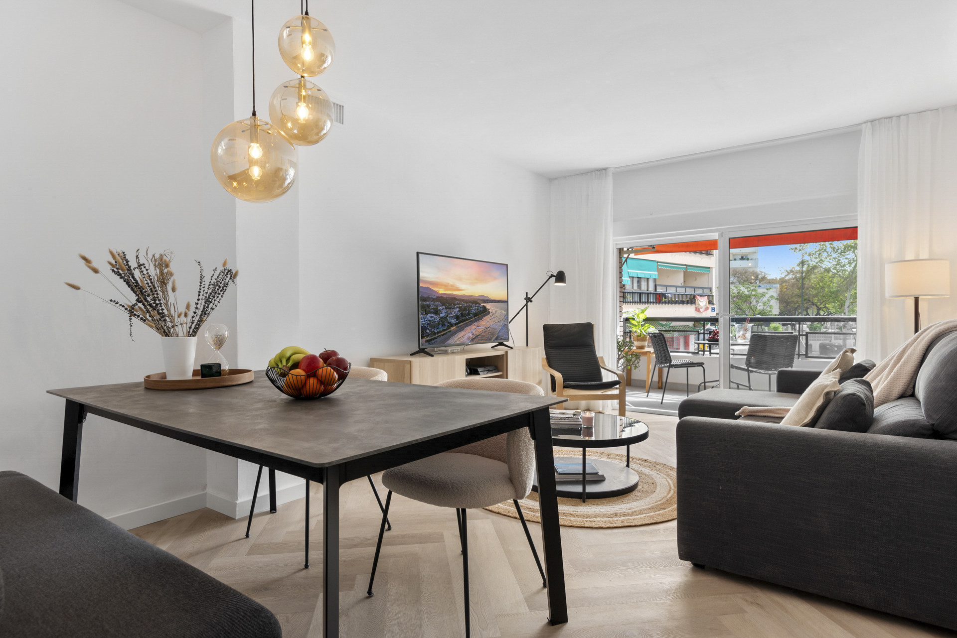 När du kliver in i lägenheten möts du av en atmosfär av lugnande komfort. Lägenheten har en rymlig layout med fräscha färger, möbler och inredning, vilket skapar en elegant men inbjudande atmosfär.