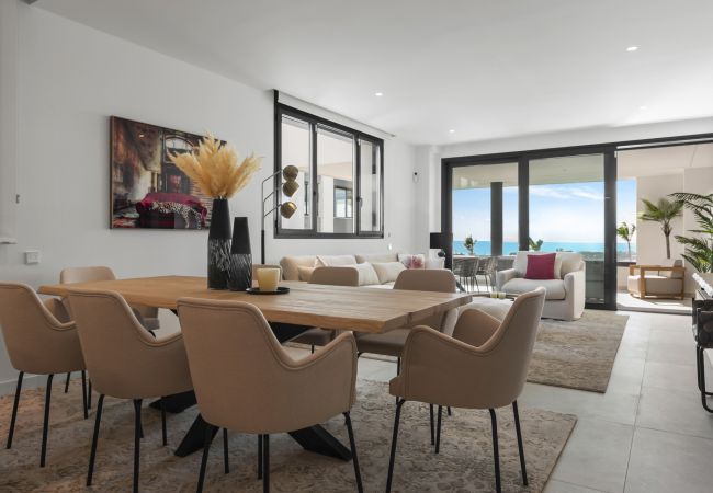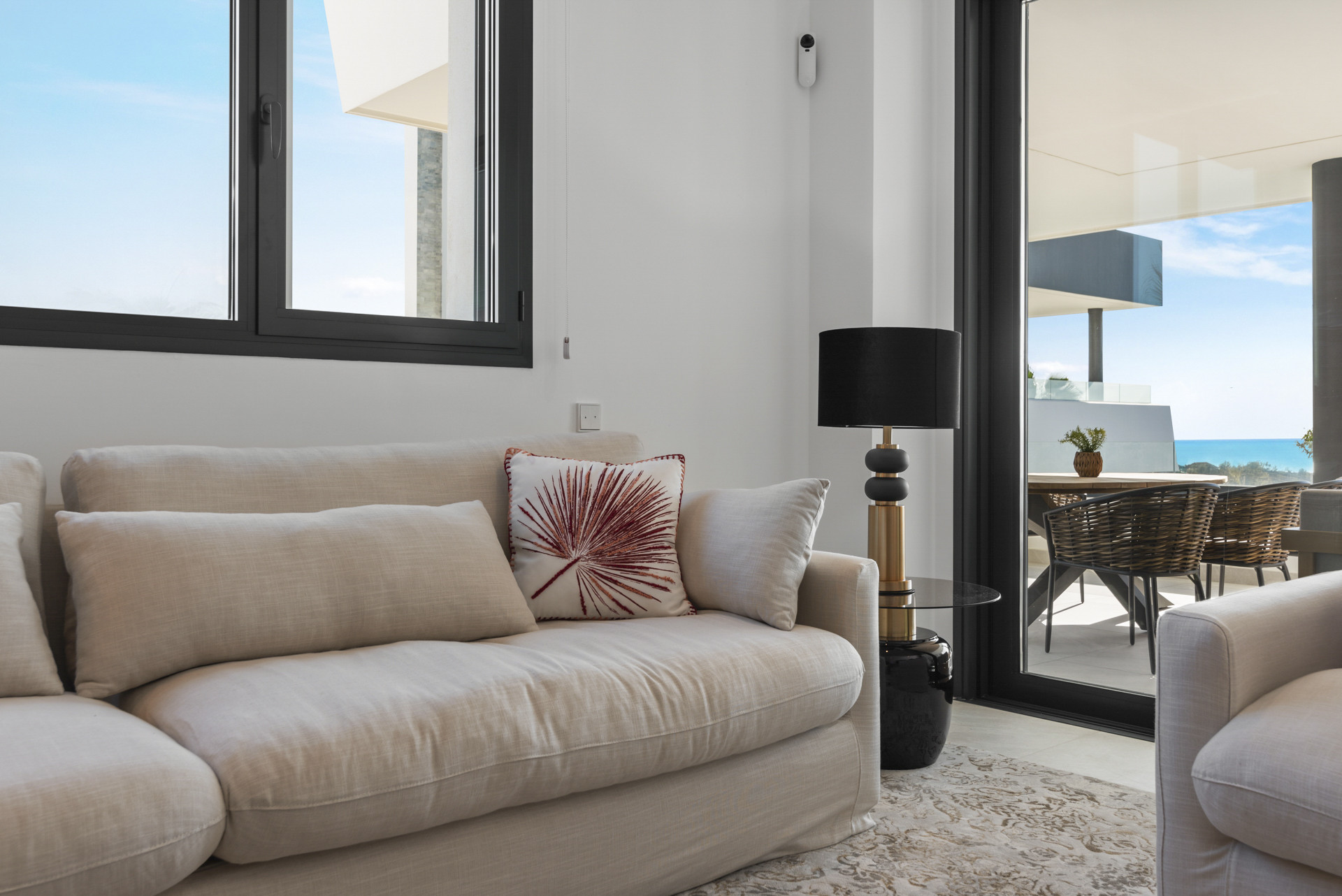 När du kliver in möts du av en atmosfär av lugn och sofistikering. Det rymliga vardagsrummet badar i naturligt ljus, prytt med eleganta möbler och erbjuder sömlös tillgång till den stora terrassen, där panoramautsikt över Medelhavet och de majestätiska bergen som omger Marbella väntar.