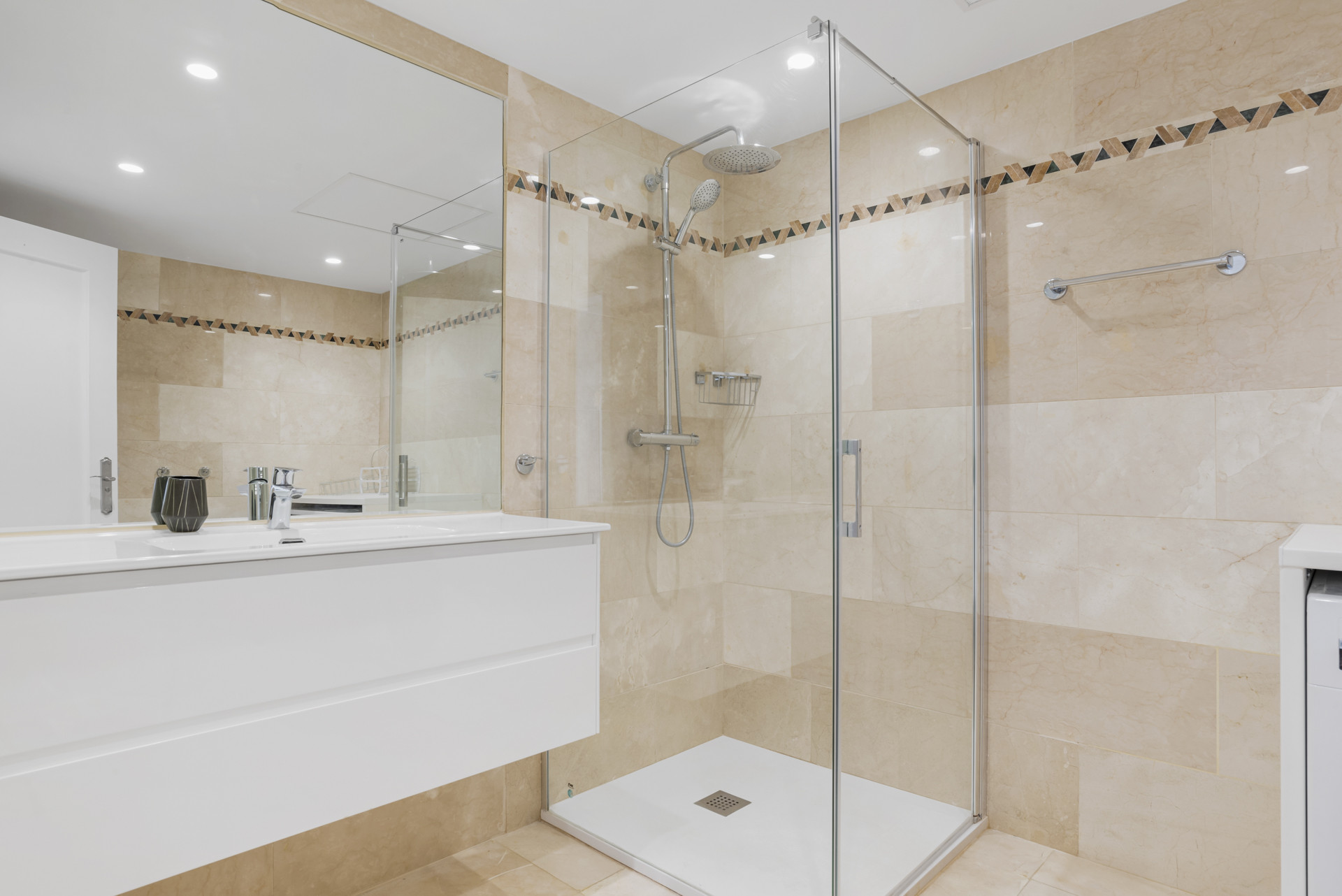 Båda sovrummen är rymliga och lugna, inklusive en generös master suite med gott om garderobsutrymme och ett privat eget badrum. Varje rum har noggrant designats för att fånga naturligt ljus och maximera känslan av rymd. Lägenheten erbjuder gott om plats att sprida ut sig på, vilket gör den idealisk för både permanent boende och exklusiv semesteranvändning.