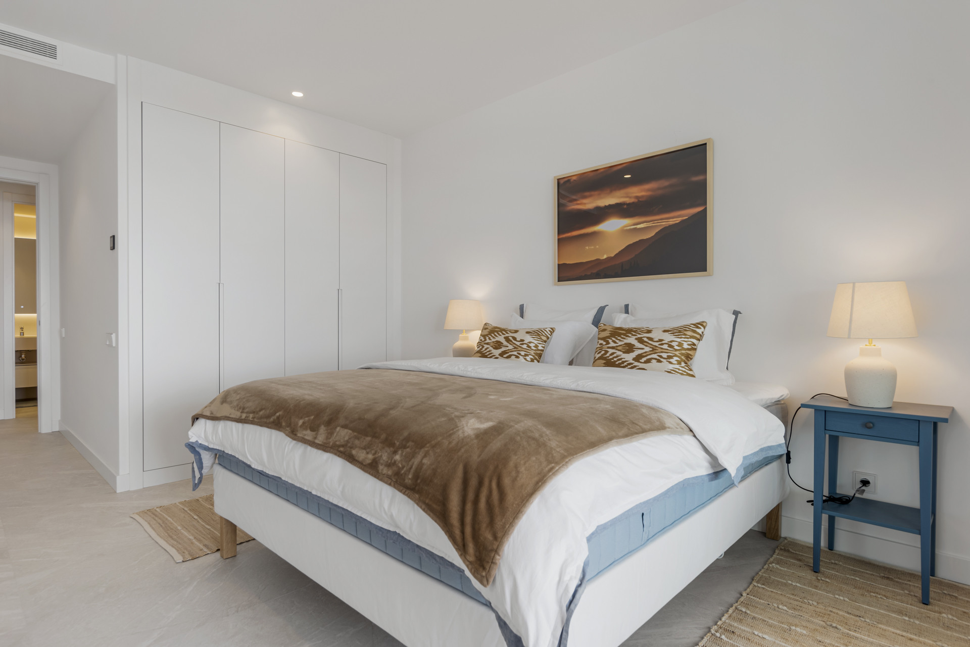 Välkommen till Casa Cielo! Casa Cielo är en vackert presenterad 2-rumslägenhet med 1 badrum i Aldea Blanca, som erbjuder modern komfort i ett av Nueva Andalucías mest eftertraktade inhägnade bostadsområden. Lägenheten har en ljus öppen planlösning där vardagsrum, matplats och kök flyter sömlöst samman och skapar en rymlig och social miljö fylld av naturligt ljus. Stora skjutbara glasdörrar förbinder interiören direkt med terrassen och förstärker den luftiga känslan överallt. Ett av sovrummen smälter obemärkt in i vardagsrummet och skapar ett flexibelt utrymme som kan fungera som ett extra loungerum eller gästområde, samtidigt som lägenhetens öppna, moderna estetik bibehålls. Varma trägolv och neutrala toner ger hemmet en lugn, modern atmosfär.
