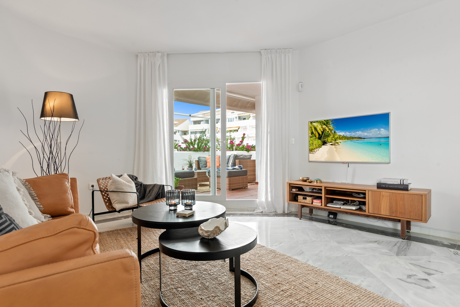 Lägenhetens läge är perfekt, nära allt men i ett lugnt område. Puerto Banús är bara 15 minuters promenad bort, liksom stranden. Du har några restauranger och barer inom 5 minuters gång, tillsammans med en supermarket. Marbellas gamla stad är 10 minuters bilresa bort, och du har 4 världsklass golfbanor mindre än 5 minuters bilresa bort (Aloha, Las Brisas, Los Naranjos och La Quinta).
