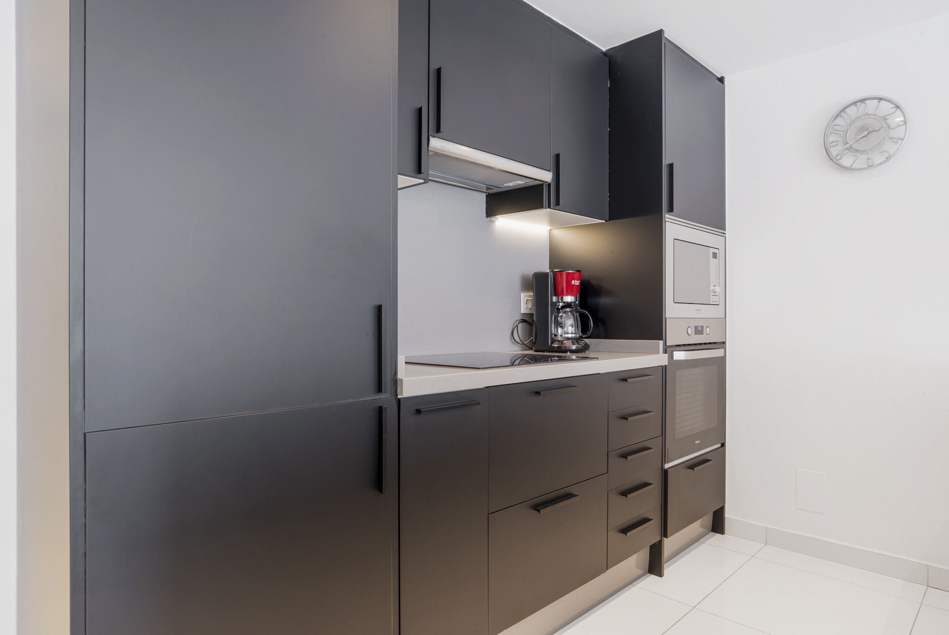 Lägenheten har ett vardagsrum med öppen planlösning med moderna möbler, ett fullt utrustat kök och ett elegant, modernt badrum. Stora fönster ger in mycket naturligt ljus, vilket skapar en välkomnande och luftig atmosfär. Båda sovrummen är utformade för avkoppling, med bekväma sängar och en minimalistisk estetik.