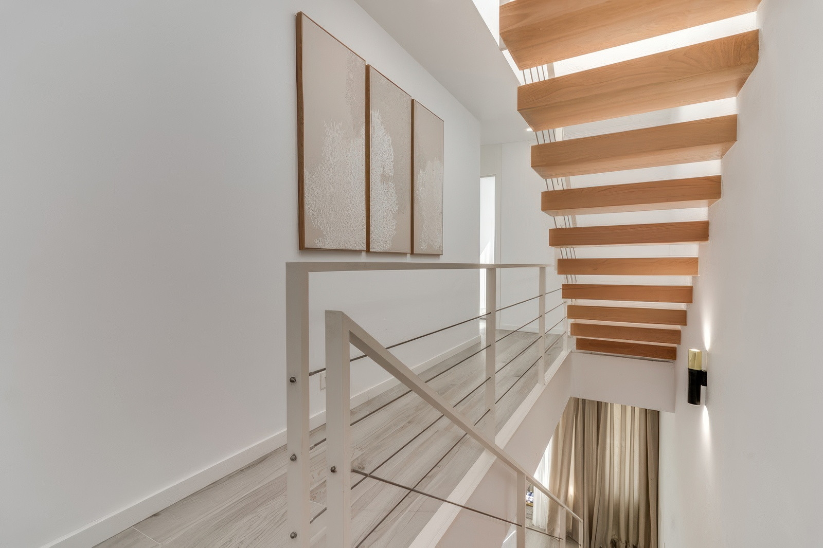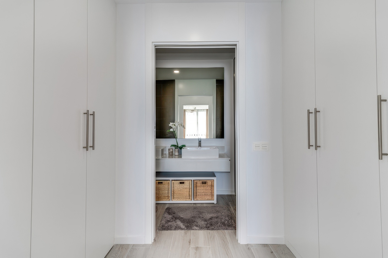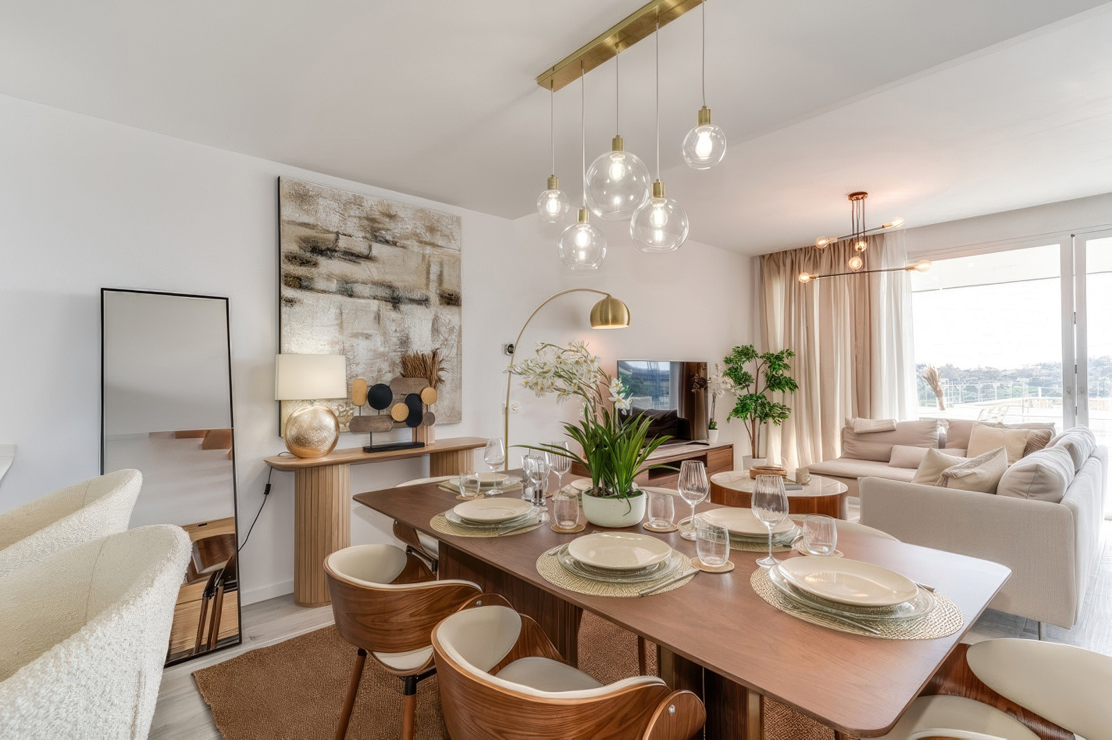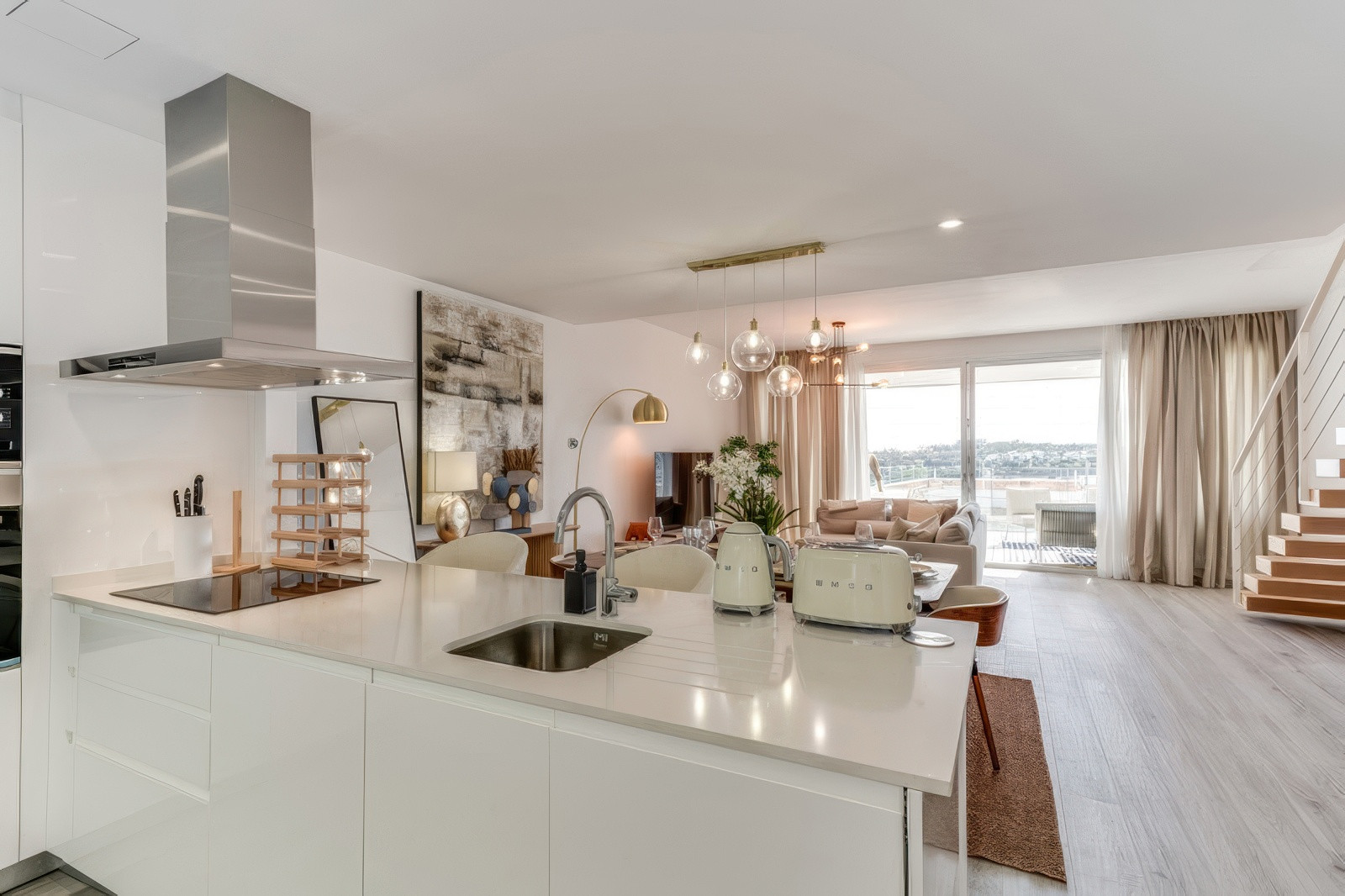 Hemmets hjärta ligger i dess öppna planlösning med vardagsrum och matplats, där naturligt ljus flödar genom stora fönster och framhäver de förfinade ytorna och den smakfulla inredningen. Köket är fullt utrustat och sömlöst integrerat i rummet, perfekt för att laga måltider att njuta av tillsammans med nära och kära. Oavsett om du vill koppla av efter en dag vid stranden eller umgås med gäster, gör hemmets stilfulla atmosfär varje ögonblick till en fristad.