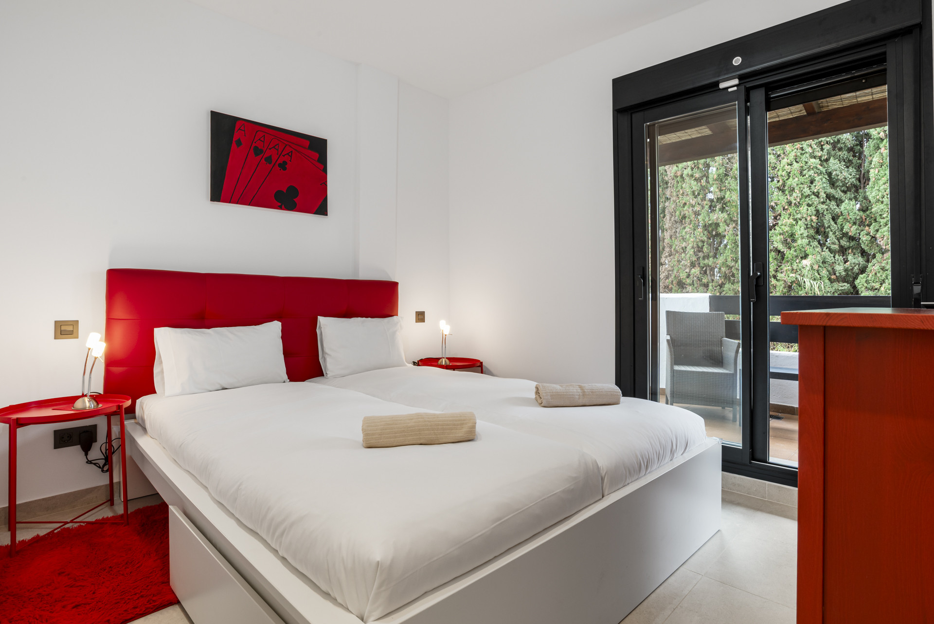 Övervåningen innehåller alla tre sovrum. Huvudsovrummet har ett eget badrum med regnddusch, TV och en privat balkong. Det andra sovrummet har en dubbelsäng, och det tredje sovrummet har också en dubbelsäng. Dessa två rum delar ett modernt badrum med en walk-in dusch.
