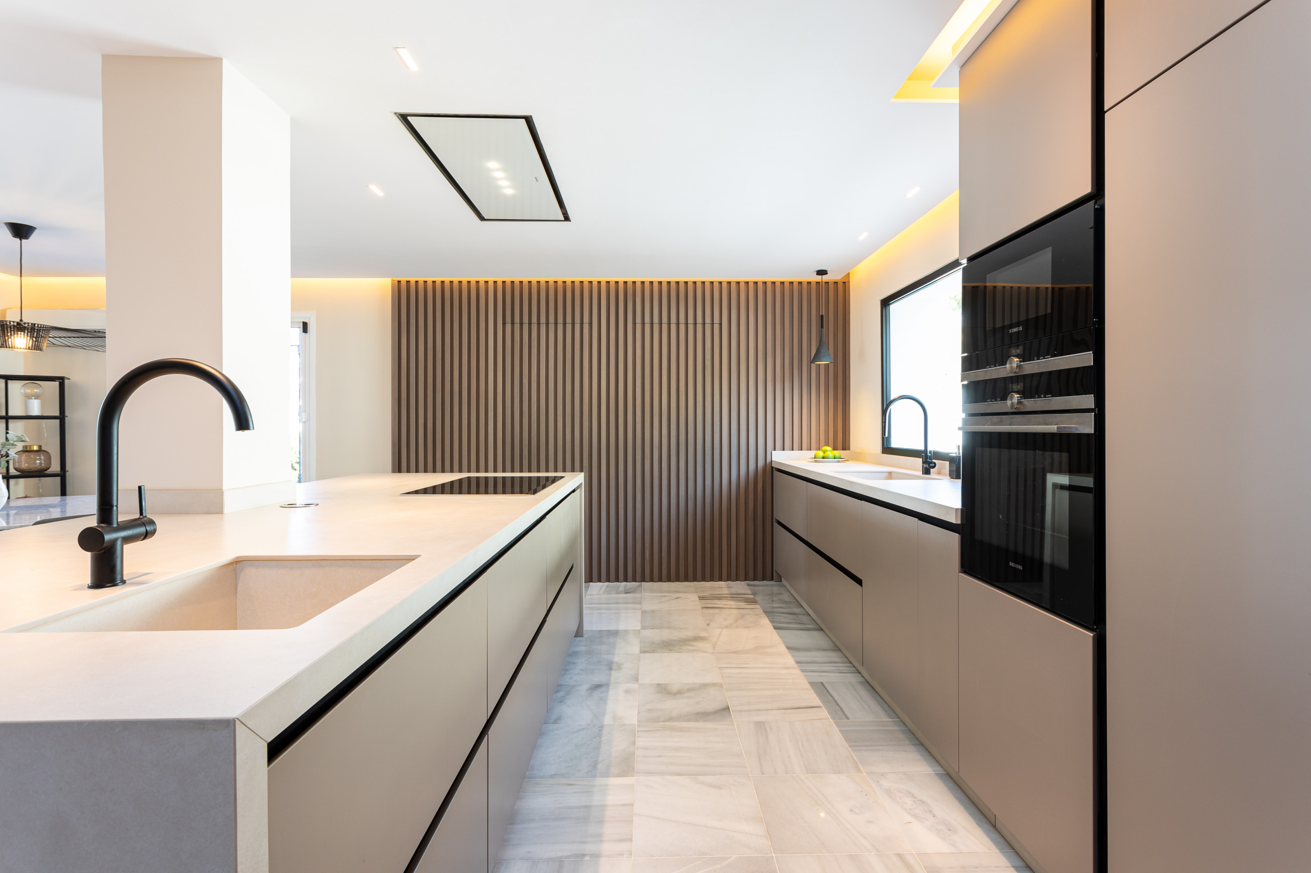 Designad med rena arkitektoniska linjer och genomgående stora glaspartier är villan badad i naturligt ljus och erbjuder en sömlös inomhus-utomhus levnadsupplevelse. Det centrala vardagsrummet är öppet och inbjudande, och flödar in i ett fullt utrustat modernt kök och matplats - perfekt för avkoppling eller umgänge i nedtonad lyx.