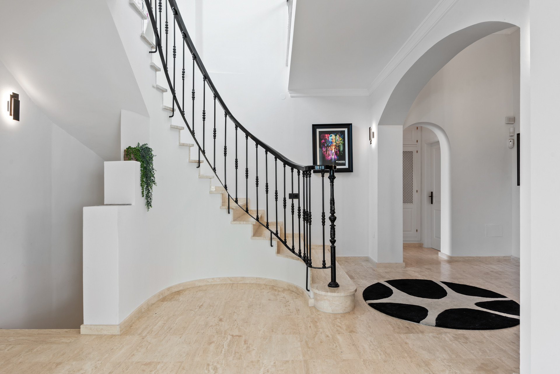 När du kliver in välkomnar villan dig med ljusa och rymliga interiörer, smakfullt designade med mjuka, neutrala dekorationer. Den öppna planlösningen flödar obehindrat från matplatsen och vardagsrummet till ett andra TV-rum, vilket skapar en avslappnad och inbjudande atmosfär. Ett fullt utrustat kök, med Bosch-apparater och en Nespresso-kaffebryggare, leder till en underbar frukostterrass med utsikt över golfbanan. Ett separat tvättstuga ger extra bekvämlighet.