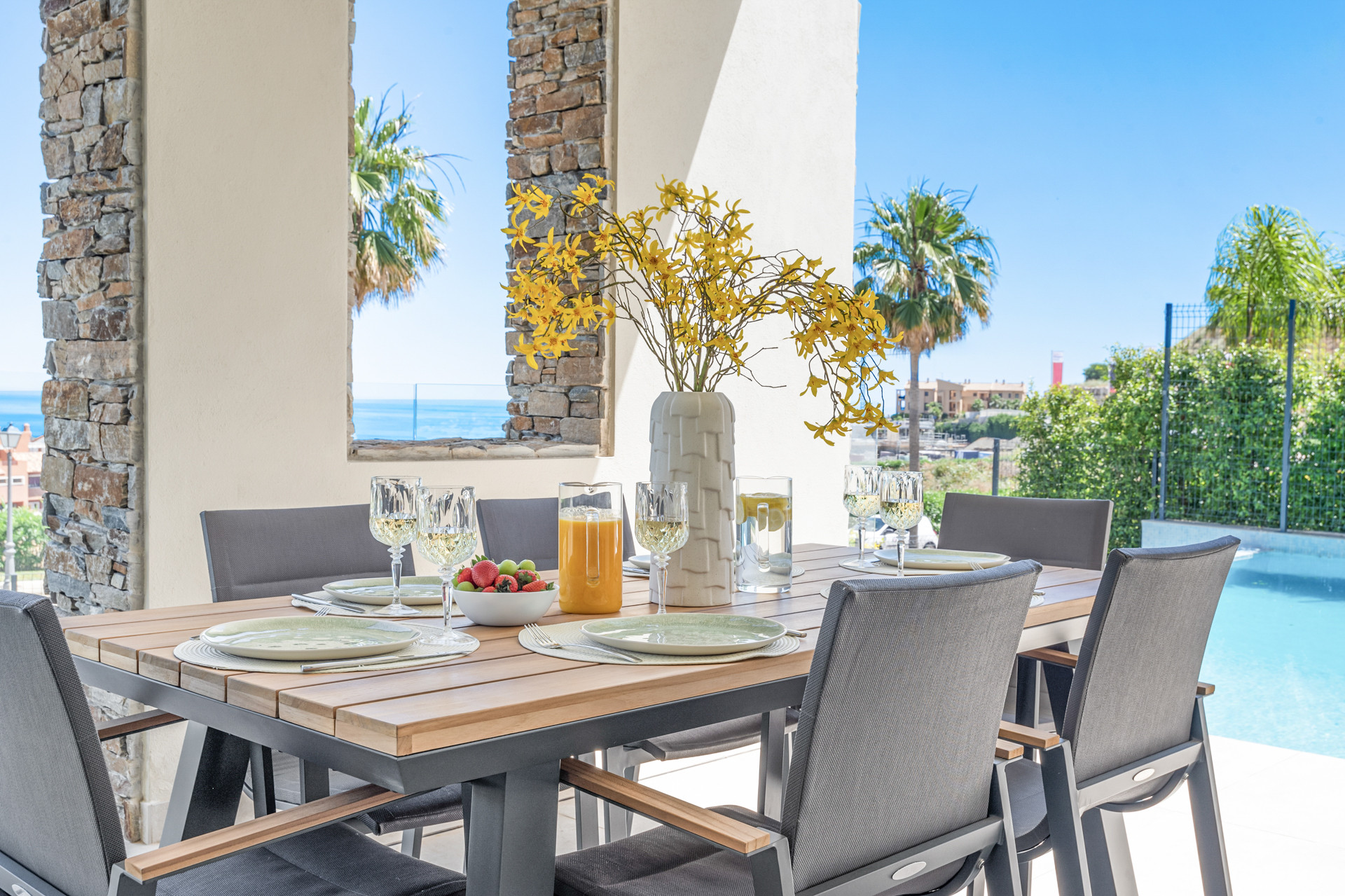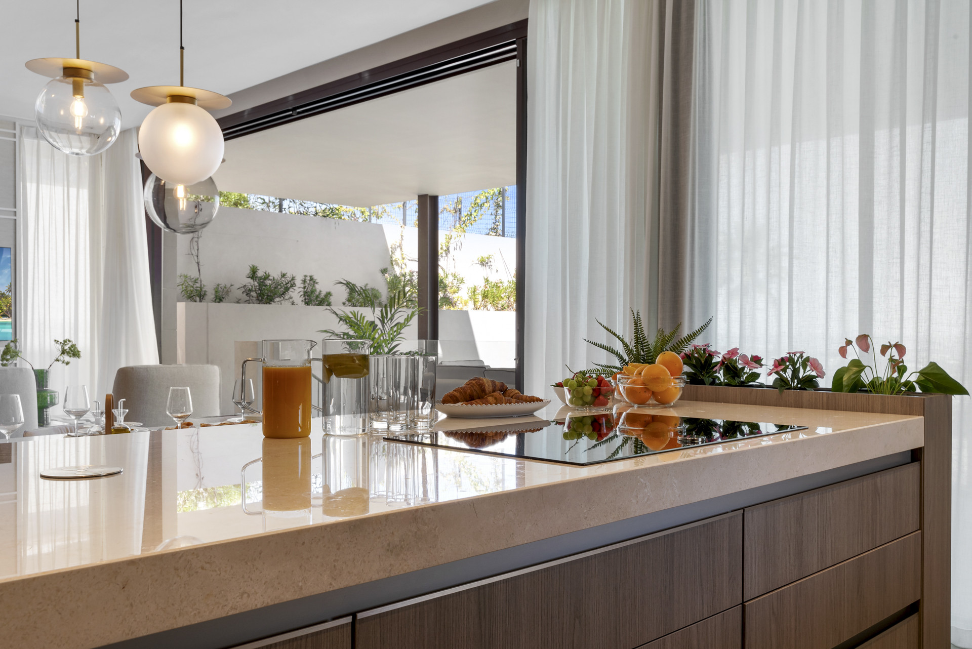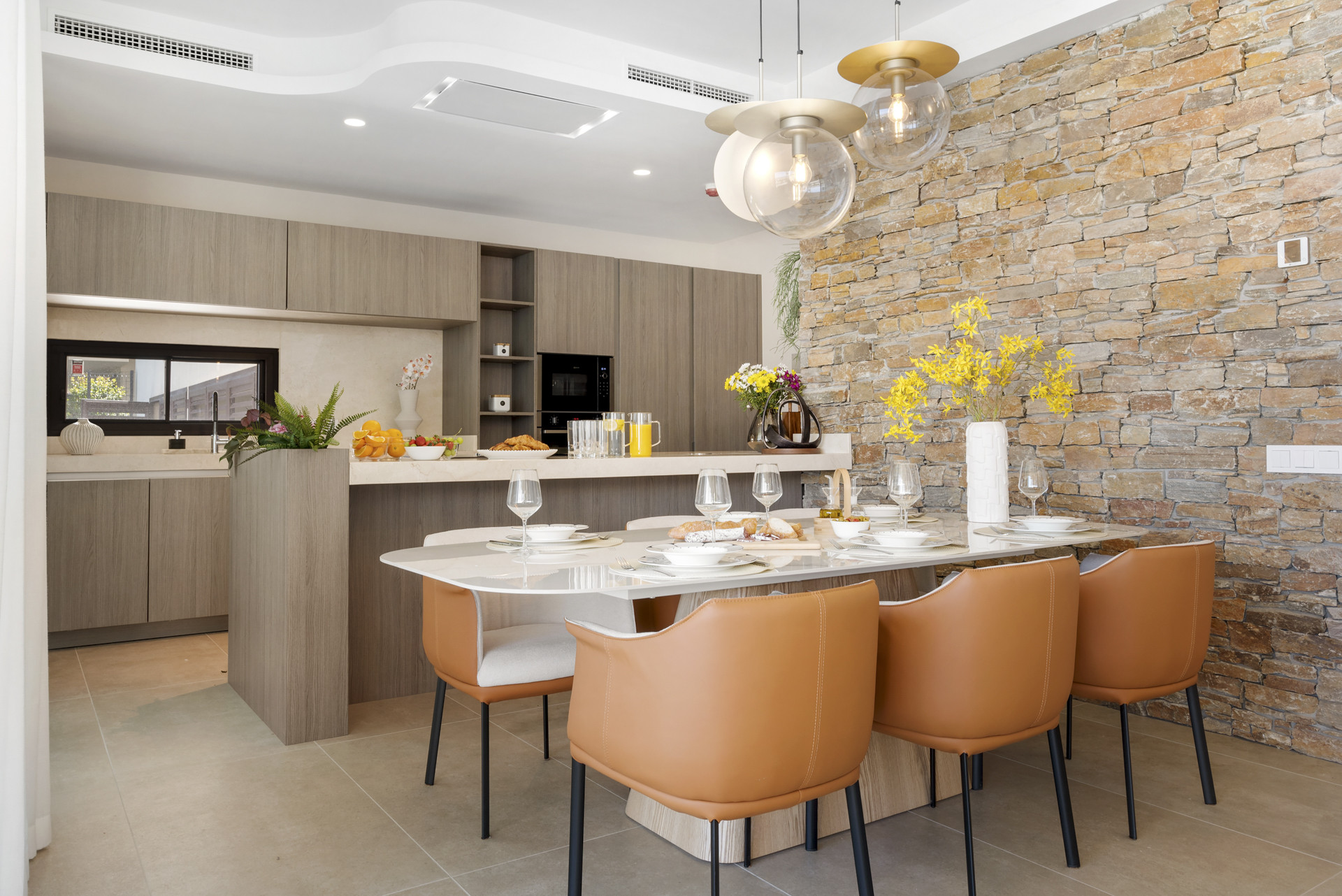 Ett stort öppet planlösningsrum för vardagsrum, matsal och kök, kombinerat med helstora fönster som öppnar sig mot terrassen, där du hittar en vacker pool och utomhusområde perfekt för avkoppling. Den sömlösa integrationen av inom- och utomhusytor skapar ett harmoniskt flöde, idealiskt för att njuta av det varma medelhavsklimat.
