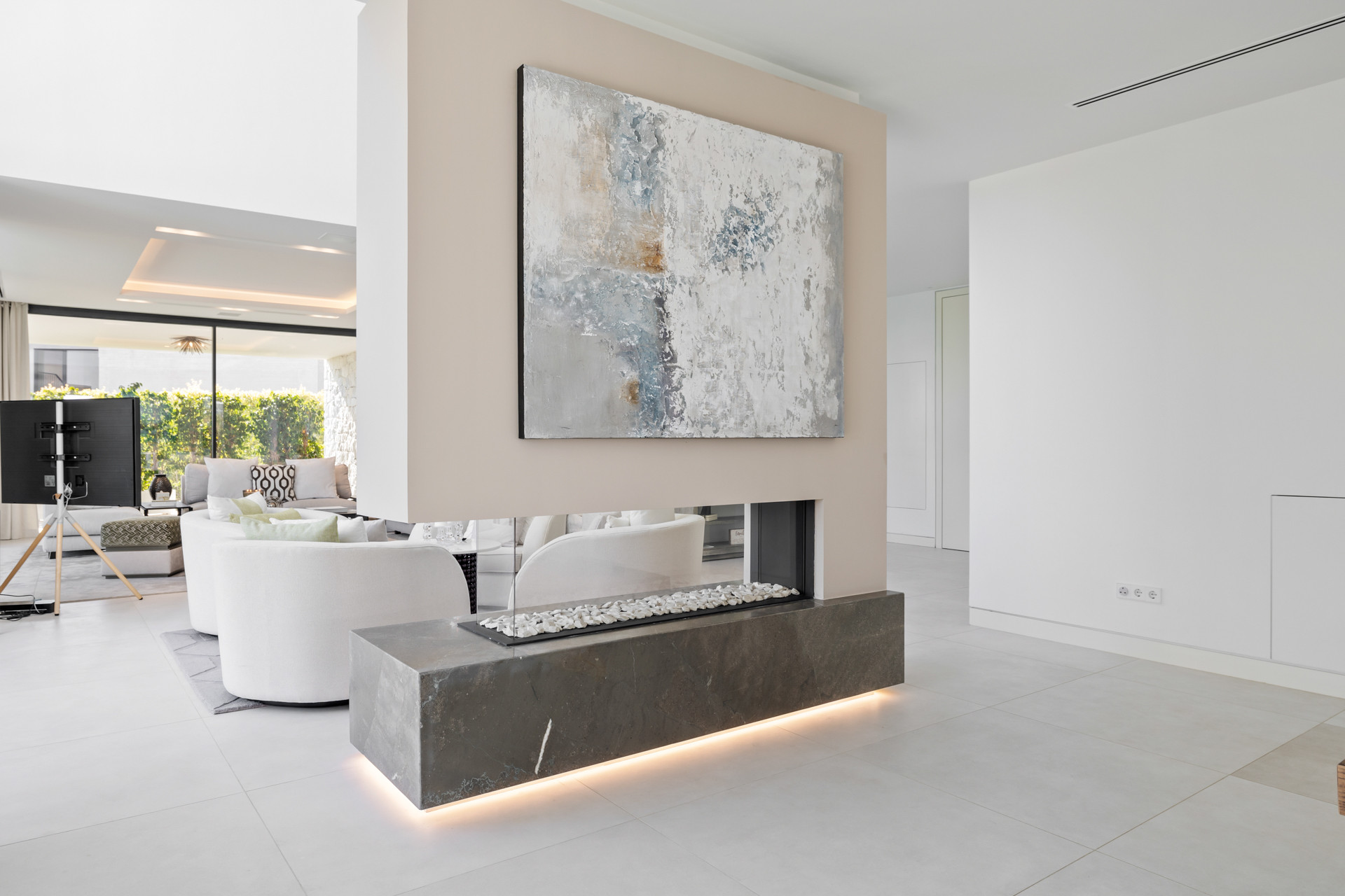 Denna spektakulära fastighet är vackert utformad med en modern skandinavisk touch. Rena och minimalistiska toner ger en känsla av sval och elegant lyx, och de stora och livliga konstverken och prydnaderna tillför en fantastisk smak till den stämning som detta hem har.