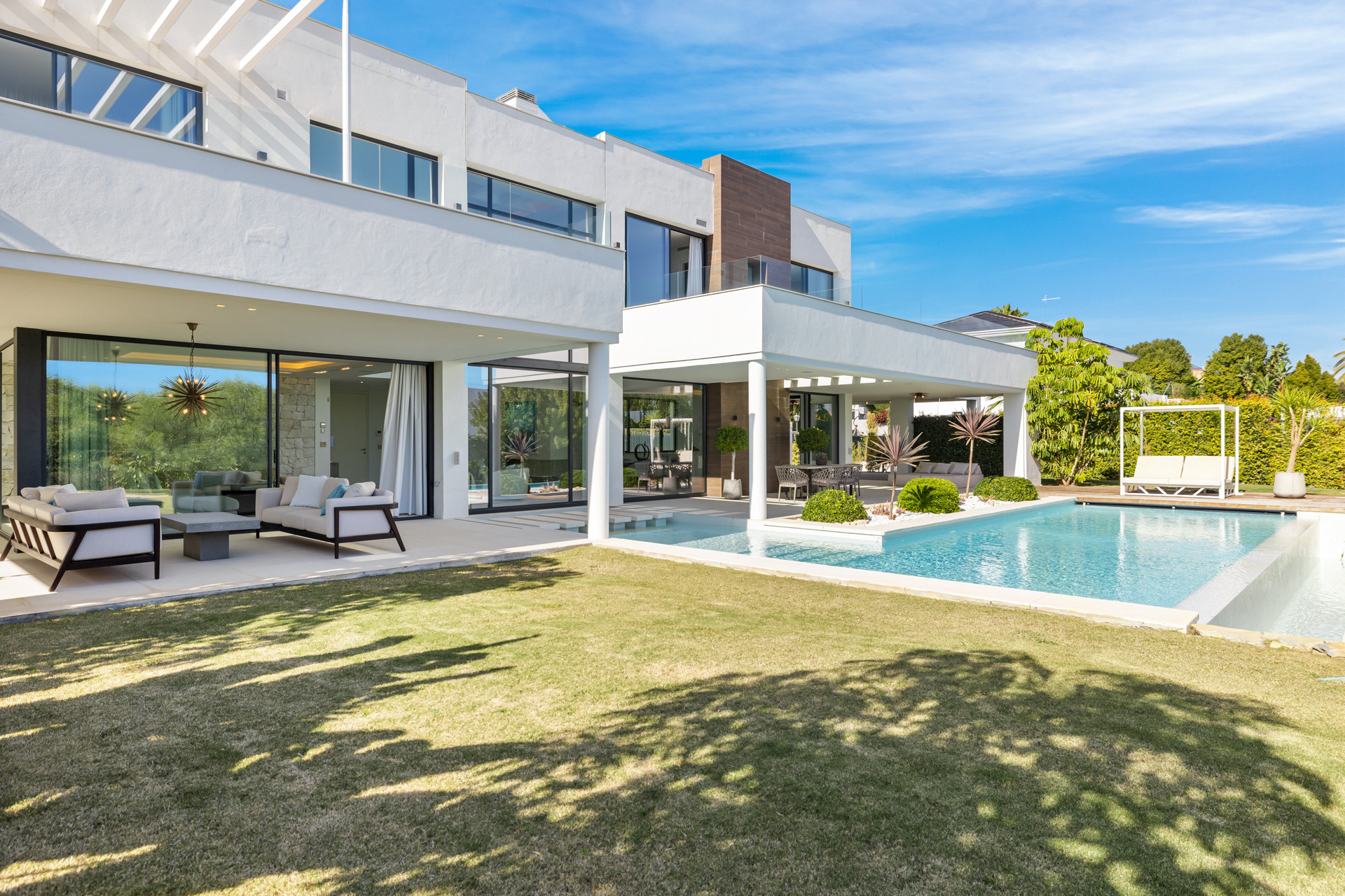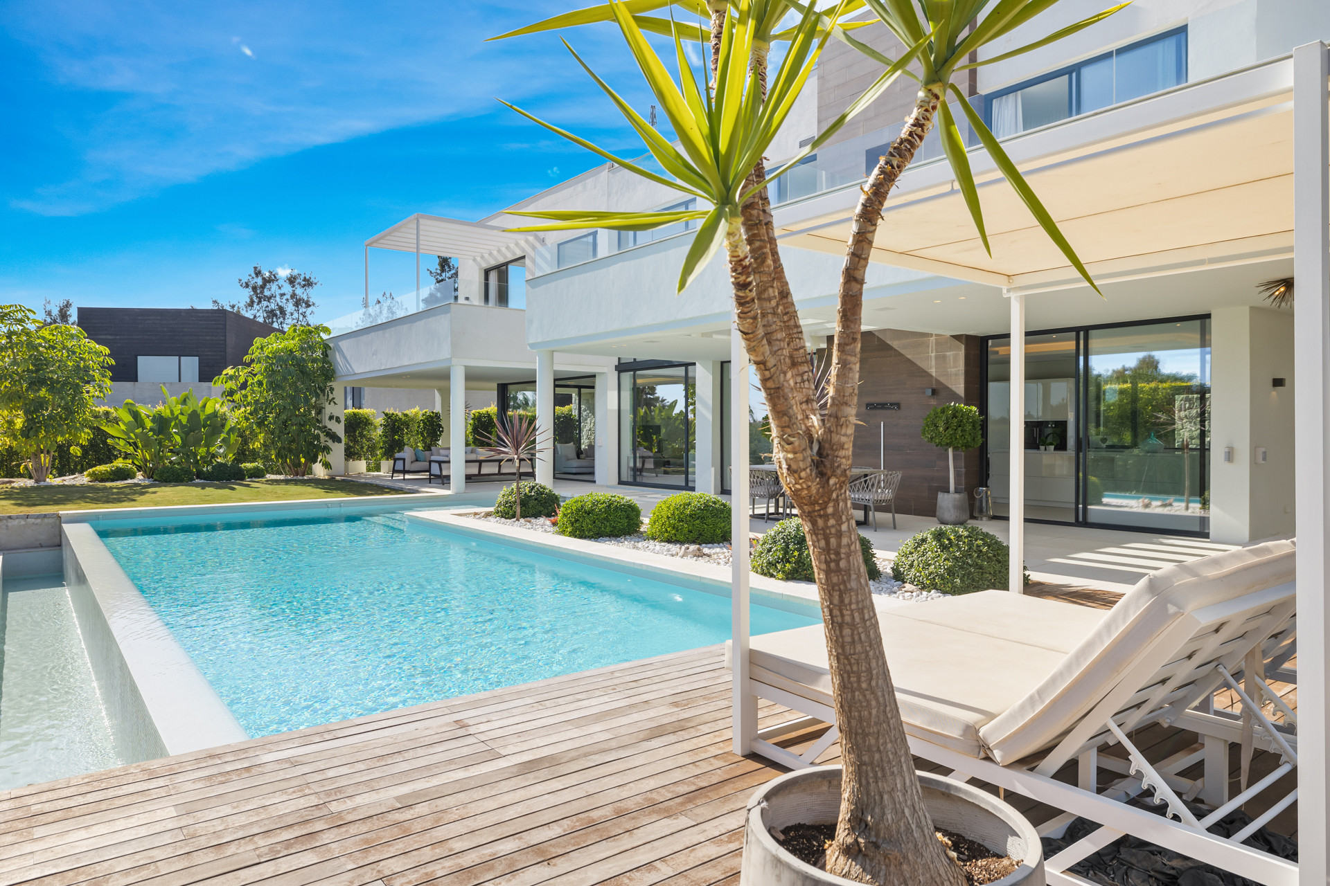 Villa Hakuna Matata – Belägen i den lugna enklaven La Alqueria erbjuder denna exklusiva 4-sovrumsvilla en blandning av elegans och komfort, med fängslande utsikt över golfbanan, La Concha-berget och en glimt av Medelhavet. Fastighetens design betonar ljus och utrymme, med stora fönster som ramar in den vackra landskapsbilden och flödar de inre utrymmena med naturligt ljus.Inuti är de öppna planlösningarna för vardagsrum och matsal sömlöst kopplade till ett väl utrustat kök, perfekt för att vara värd eller avslappnade kvällar hemma. Varje sovrum har utformats som en privat fristad, med komfort och smakfull inredning med enkel tillgång till utsikt eller utomhusytor.Utanför erbjuder villans terrass och privata poolområde en inbjudande plats att koppla av, antingen genom att njuta av en morgonkaffe med utsikt över bergen eller ett kvällsdopp. De landskapsplanerade trädgårdarna förstärker ytterligare känslan av lugn, vilket gör Villa Hakuna Matata inte bara till en förfinad tillflyktsort utan också ett perfekt hem för att omfamna den lugna Costa del Sol-livsstilen.Observera att vi endast välkomnar familjer och par, inga grupper under 30 år och inga svensexa- eller möhippor. Om du faller utanför denna kategori men ändå vill boka, skicka oss en förfrågan där du berättar lite mer om dig själv och den grupp du kommer att resa med så att vi kan begära detta för dig.Vi ser fram emot att hälsa dig välkommen!
