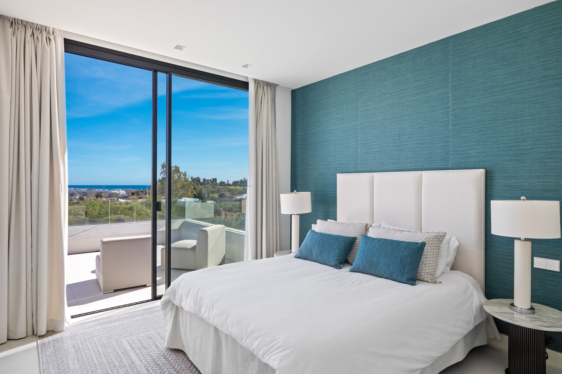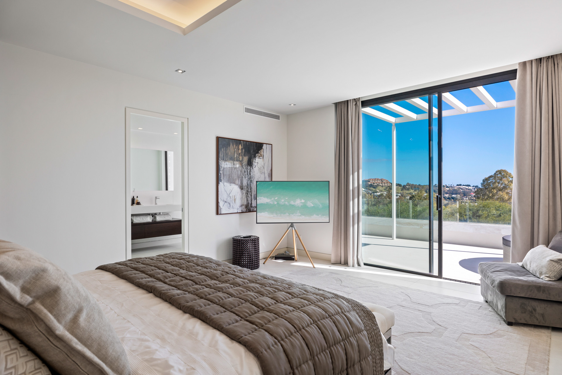 Medan du går uppför trappan är Master Bedroom naturligtvis magnifik. Sängen är vänd rakt ut mot den privata terrassen, och du har glädjen att vakna upp till de lugna vyerna som sträcker sig över en full 180 grader från bergen till vänster så långt som havet till höger. Det tillhörande badrummet här har också ett vackert badkar och en regndusch, och rummet har en Smart-TV.