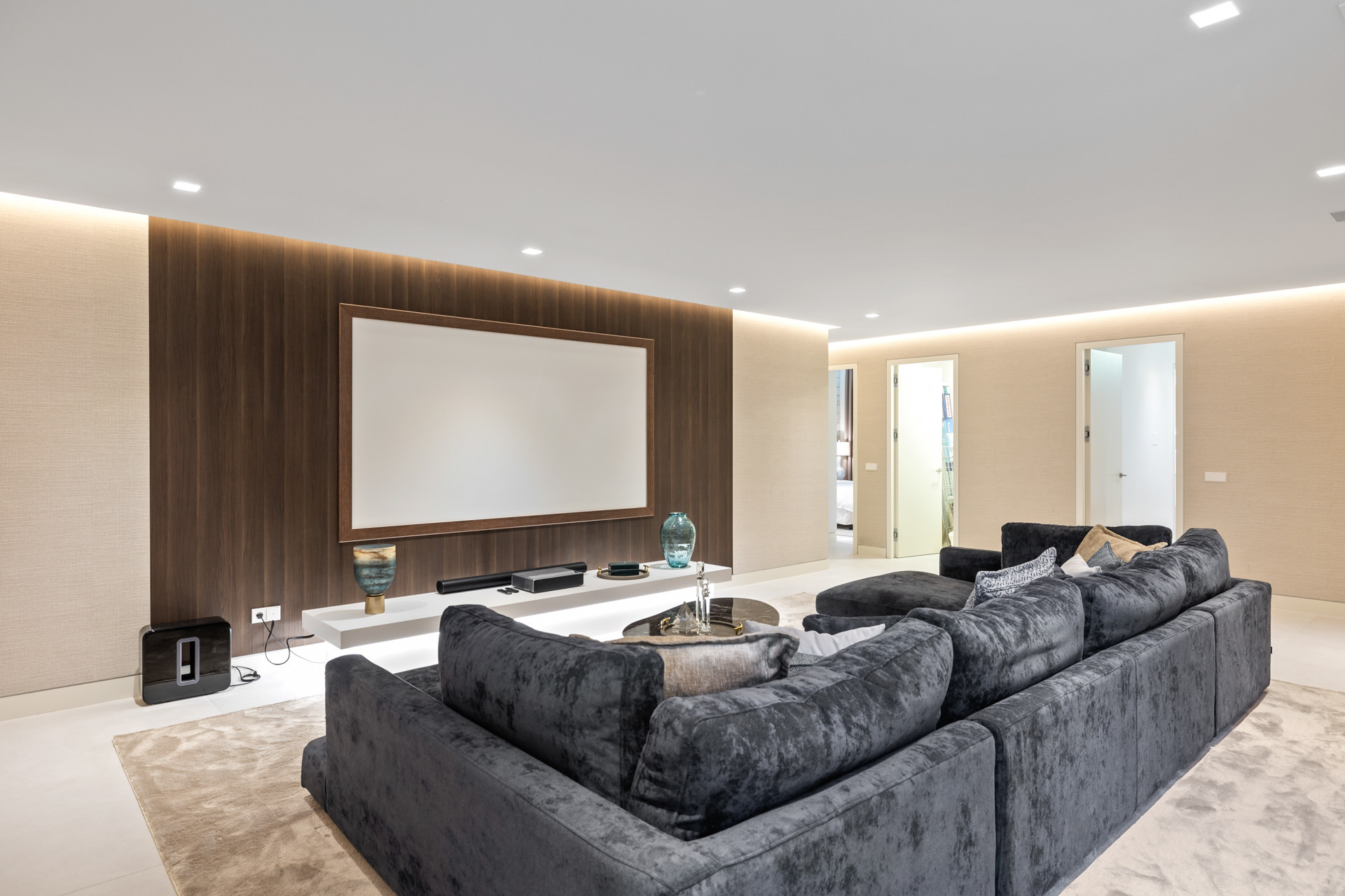 Nere finns det fantastiska Biografrummet – med en gigantisk skärm och ljudsystem samt en mjuk, len soffa som sträcker sig över rummet, du kommer säkert att få en underbar tittarupplevelse!