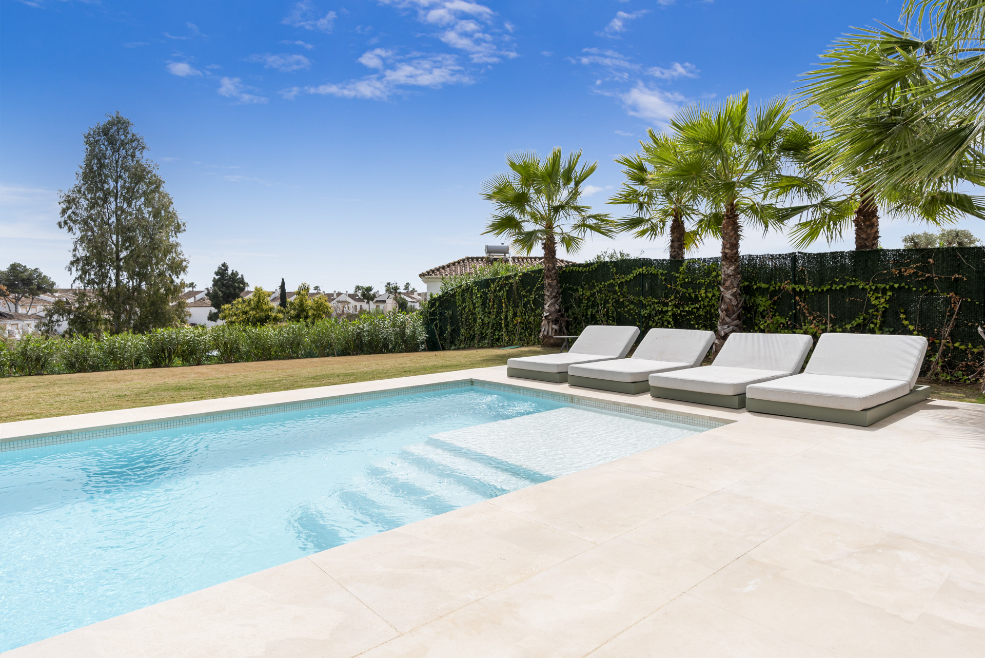 Outside Villa Lulu, a generously sized garden provides ample space for relaxation and recreation, while the option to heat the pool ensures year-round enjoyment (pool heating has an additional cost).