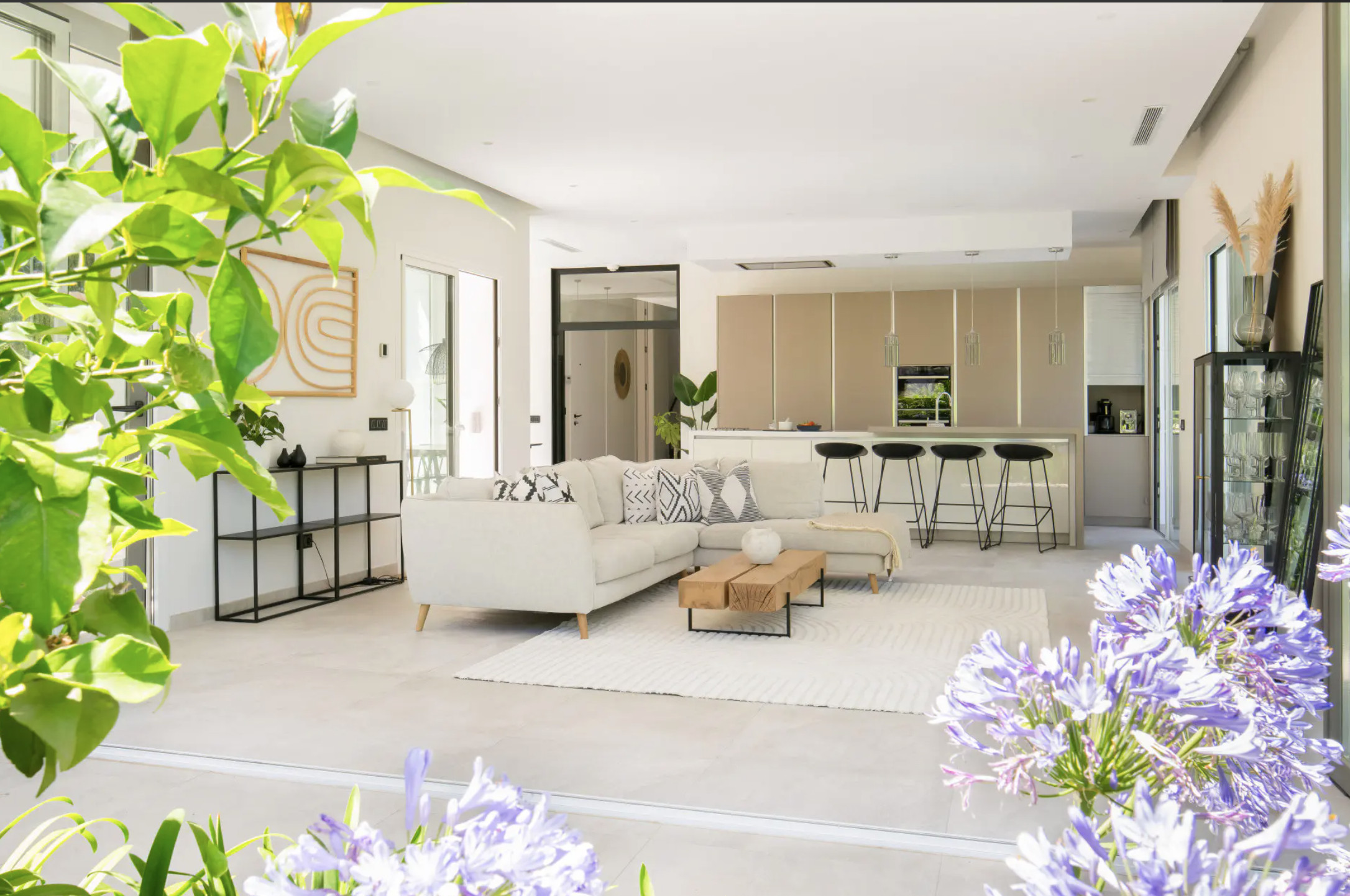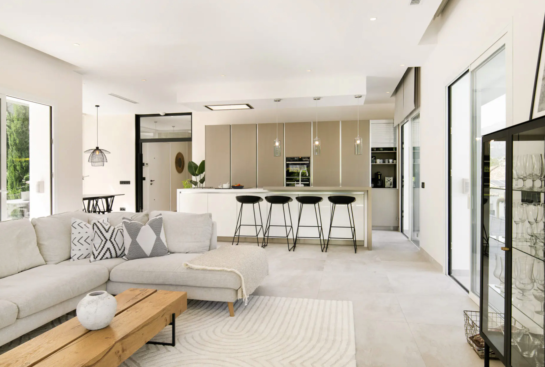 Inuti Villa Enso råder en obehindrad elegans. Det öppna köket flödar sömlöst in i vardagsrummet och skapar en ljus och social kärna i hemmet - perfekt för gemensamma måltider och avslappnade samtal. Ett separat TV/biografrum ligger intill det fullt utrustade gymmet, båda på samma våningsplan, och erbjuder mångsidiga utrymmen för underhållning och välmående. Varje sovrum är genomtänkt stiliserat för vila och privatliv, medan moderna detaljer och förfinade möbler höjer varje hörn av hemmet.